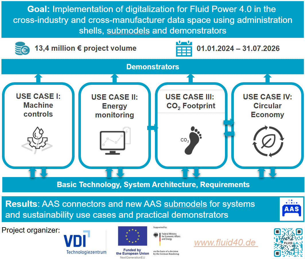 Im Projekt Fluid 4.0 arbeiten Fluidtechnikhersteller, Maschinen- und Anlagenbauer, Anwender und Dienstleister gemeinsam an der Digitalisierung der Fluidtechnik mittels Verwaltungsschalen, Teilmodellen und Demonstratoren. Dabei werden sowohl konkrete Anwendungsfälle als auch übergreifende Herausforderungen behandelt.